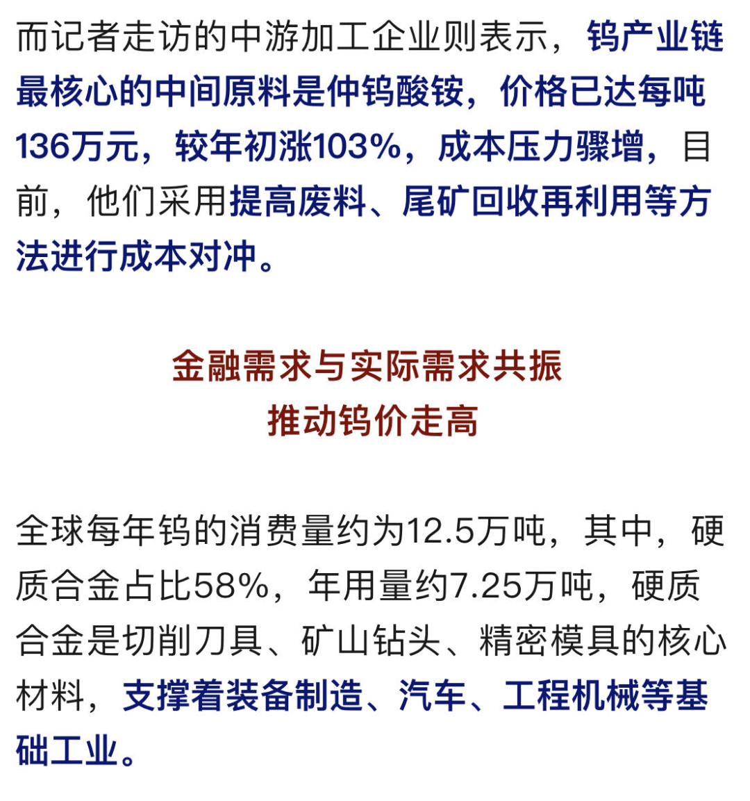 国信期货首席分析师 顾冯达:智能化的加强,相关精细化加工呈现爆发式增长。另外一方面,整个市场在探索和探讨这种战略资源超硬合金的储备,加强其金融端的需求增长。所以,实际需求和金融需求共振叠加,是本轮需求爆发式增长的核心动力之一。